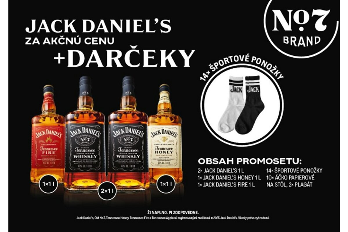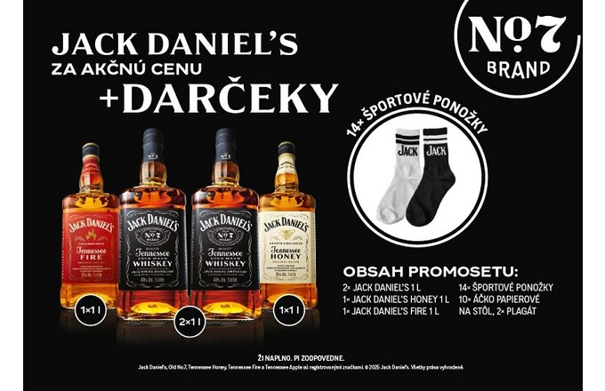 Popis:Jack Daniel´s PROMOSET obsahuje:2x Jack Daniel´s 1l1x Jack Daniel´s Fire 1l1x Jack Daniel´s Honey 1l14x športové ponožky10x áčko papierovné na stôl2x plagát